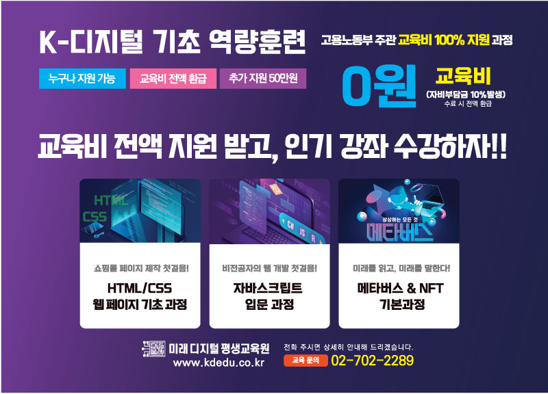 정부에서 교육비를 100% 전액 지원하는 디지털 교육 프로그램으로 국민내일배움카드를 신청할 수 있는 사람이면 누구나 신청 가능한 교육